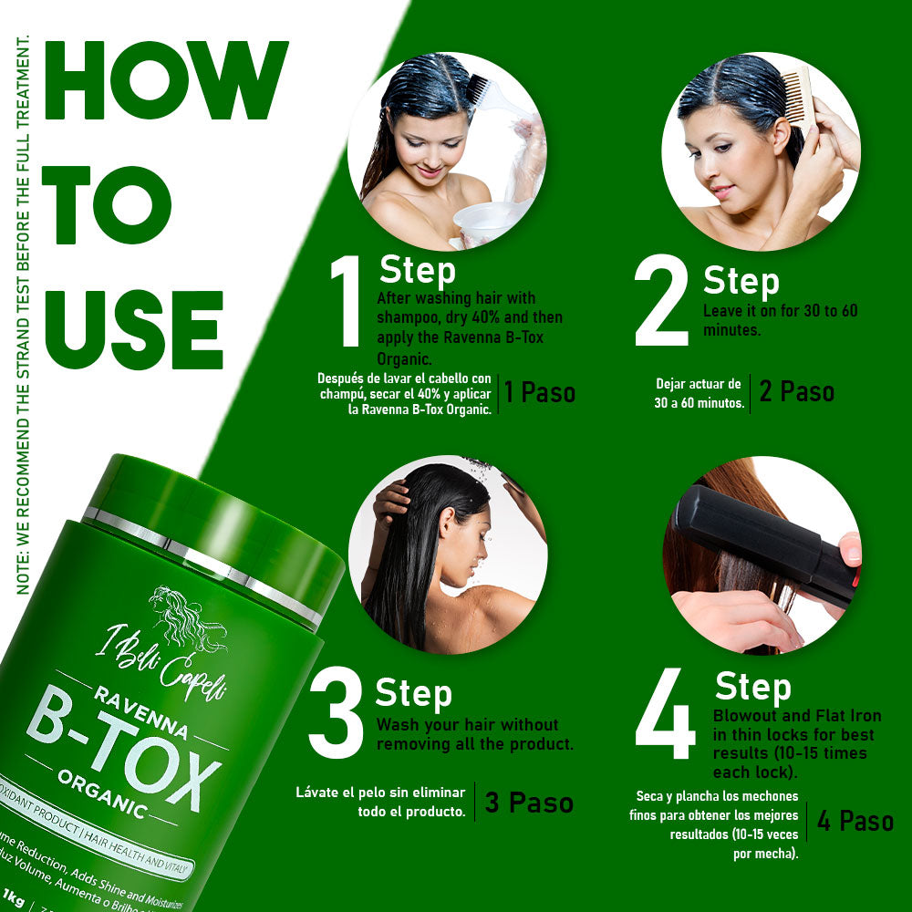 After washing the hair with a clarifying shampoo, partially dry the hair (about 40%) and apply the B-tox Organic. Leave it on for 15 to 60 minutes, depending on the desired straightening effect. Separate the hair into fine sections, blow-dry completely, and finish with a flat iron. Once the hair has cooled, rinse lightly if necessary and style as desired. Then, at the next hair wash, apply the Ravenna Hair Mask to clean, damp hair, distributing it along the lengths and ends. Leave it on for 3 to 5 minutes and rinse thoroughly.