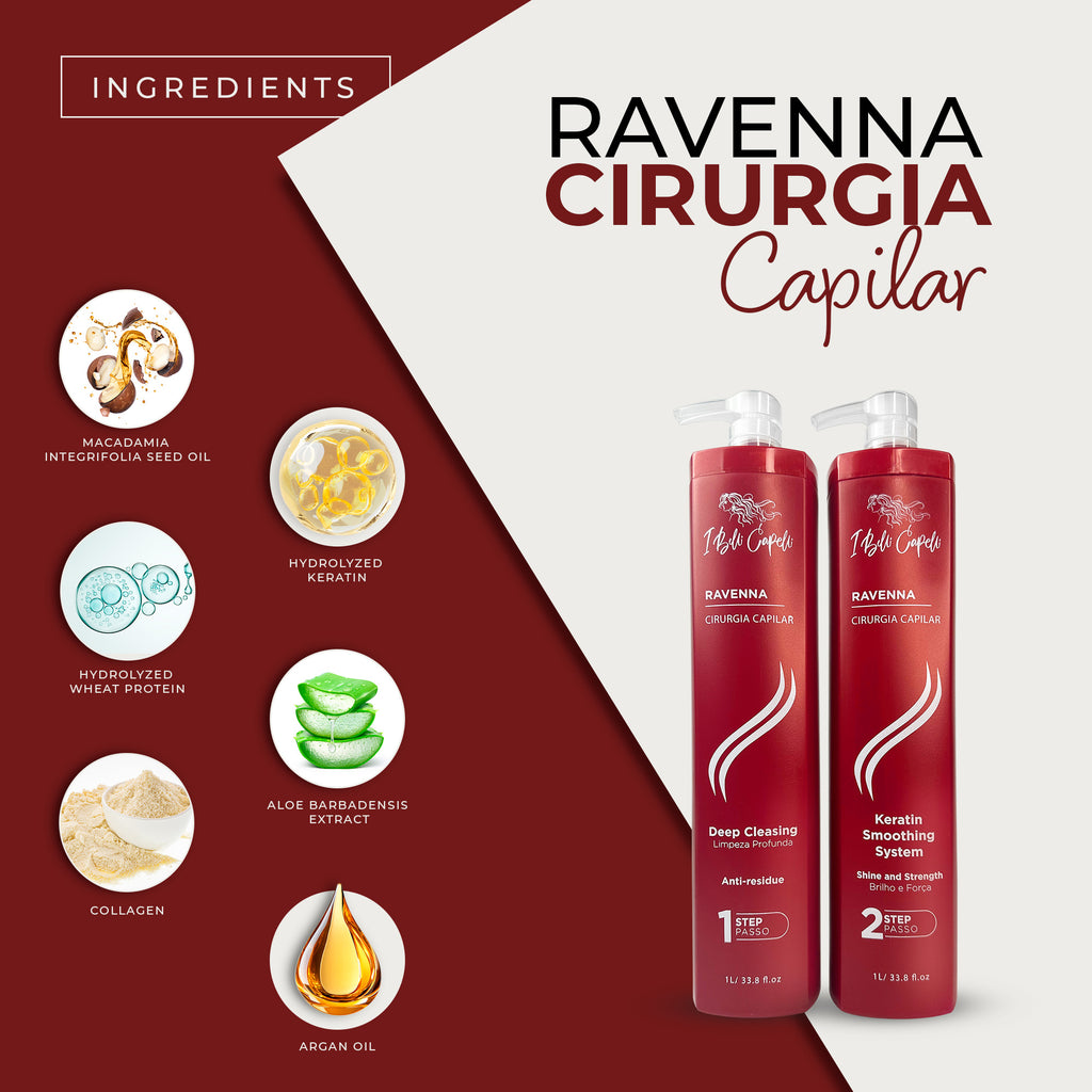 The I Belli Capelli Ravenna Hair Surgery Kit includes Anti-Residue Shampoo and Reconstructing Gloss, which together work to repair and realign the hair. The shampoo prepares the hair with a deep cleanse, while the Reconstructing Gloss acts with a mixture of amino acids and hydrolyzed keratin, filling in gaps, protecting the hair and keeping it aligned for longer. This combination is enriched with vitamins A, B and E, as well as Coconut Oil, Wheatgerm and Aloe Vera, guaranteeing nutrition, growth and daily hydration.